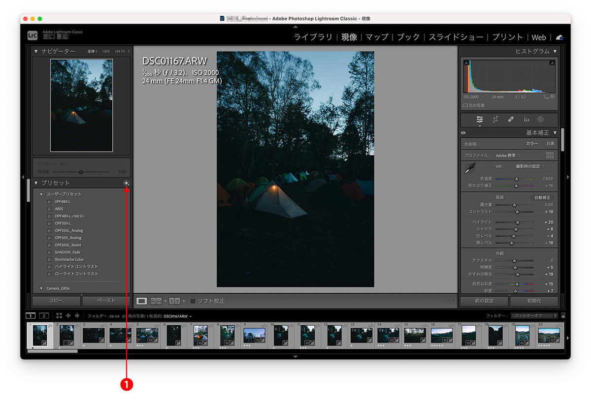 Select "Load preset..." from ❶ on the preset palette, select the downloaded preset file (xmp), and load it as a preset.
